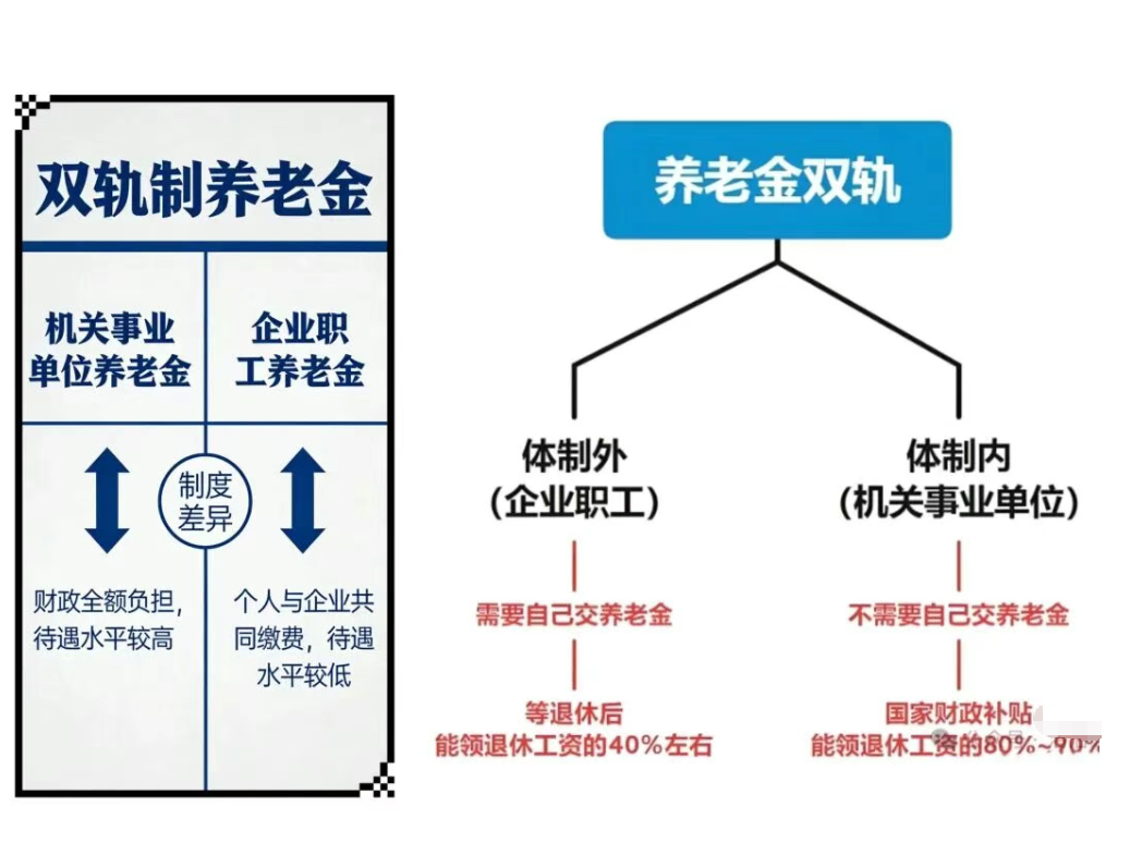 还有一个机关事业单位人员,同为1965年左右出生,满60周岁,开始领取养老金,虽然在2014年,养老金并轨政策过渡已开始执行,即2024年10月过渡期结束后,所有机关事业单位退休人员将统一按新办法计发养老金。并轨前,体制内人员退休不需要交养老金,国家财政补贴,退休工资的替代率可以达到80%-90%,但对于60岁领取退休金的他,其中有一个“保高限低”的政策,对于过渡期的中人,其实他的影响很小,替代率仍然可以妥妥的达到80%。(如图2,养老金并轨)但这还没完,大家再回到(图1,第二支柱),同样也是2014年,机关事业单位开始执行职业年金,作为养老保险的补充,很少人拥有第二支柱,拥有职业年金的一般是机关事业单位人员,拥有企业年金的一般是收益很好的私企,如互联网大厂员工,金融从业者,但是他们显然还没有退休。